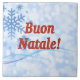 Buon Natale! Feliz Natal no italiano. Poucos grandes flocos de neve em um branco e em um azul orbed o fundo. Pia batismal vermelha