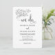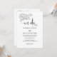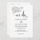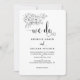 Um convite de casamento moderno e elegante, "nós fazemos", com uma elegante caligrafia de swash anunciando, "nós fazemos", com uma fonte clássica de serifa pequena para detalhes que lhe dão um convite minimalista, formal, preto e branco com uma atualização moderna. Um buquê branco desenhado com a mão pendura do canto esquerdo acima, "nós-do."