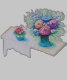 Flores vibrantes em tons de rosa, roxo, laranja e azul são representadas em estilo de desenho solto, com um grande buquê em um vaso azul e um pote menor em uma mesa claramente marcada. As braçadas são expressivas e coloridas, transmitindo um senso de vida e espontaneidade artística.