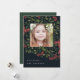 O cartão com fotos de feriado elegante apresenta uma foto favorita cercada por uma borda geométrica de uma folhagem botânica verde-luxuosa e minúsculos florais vermelhos em um fundo rico de marinho. Seu cartões de natal personalizado e seu nome ou nomes de família aparecem na parte inferior em caracteres de cinza. Personalize as costas com duas fotos adicionais e uma mensagem pessoal contra um fundo verde caçador.
