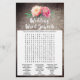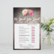 Este buquê rústico de flores "ele disse que ela disse" é perfeito para um chá de panela temático floral. A frente do cartão de jogo apresenta "ele disse que ela disse" o que é um teste divertido sobre noiva e noivo. A parte de trás do cartão contém uma palavra encontrada com palavras e frases relacionadas ao casamento. O design apresenta um arranjo elegante de peônias cor-de-água rosa e pinceladas em um fundo texturizado de madeira. Personalize o cartão de jogo com o nome das noivas e a data do chá de casamento.