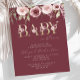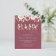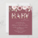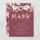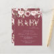 Este doce convite para chás de fraldas apresenta uma borda superior de flores de cor-de-água cor-de-rosa e borrão. Abaixo, as palavras "baby in bloom" aparecem em letras douradas adornadas com buquês arrojados e embaçados, com as palavras "in bloom" no elegante roteiro de escrita manual burgundy abaixo. Personalize o texto com o nome da futura mãe na escrita burgundy e os detalhes na fonte serif de cinzas de carvão em fundo burgundy. Um padrão floral vermelho e borrado de coordenação aparece na parte traseira do cartão.