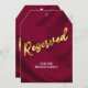 Etiqueta de Casamento de Assentos Reservados - Burgundy & Dourada, Big on Style Quando sua lista de convidados inclui lendas - como a vovó com as histórias, a Maçã de Anéis com agambre, ou a Bridesmaid tornou-se rainha da pista de baile - você não salva assentos, você os alega com talento. Entra nesta etiqueta de seda-suja-suja sobredimensionada com uma escrita em folha de ouro: dramática, deslumbrante e totalmente merecedora de um holofote. Impresso em um estoque de cartão de peso alto com uma textura rica em satins e uma caligrafia de ouro brilhante, esta etiqueta não cai nem desaparece — ela se mantém e aparece. De tamanho perfeito para prender, deitar ou prender nas cadeiras ou nos ajustes, ele traz borda elevada para cada assento. Totalmente personalizável e indesculpavelmente divertido: adicione títulos, nomes ou etiquetas visuais como "VIP of the Cake Mesa" ou "Bride's Ride-or-Die". Quer seja o glam do jardim do seu tema ou o clássico de candelabro, esta etiqueta toca bem com qualquer vibração de casamento. Incrivel e prático, é a solução de assentos que é chamada a impressionar e construída para durar. Porque os convidados podem esquecer a entrada — mas não o assento que dizia, "Sim, este é seu."