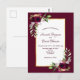 Na frente: Um fundo burguês escuro com um falso ouro e quadro branco. Decorado com flores, rosas, penas e verde de estilo boho. Modelos para seus nomes e detalhes do casamento. Os nomes são escritos com um estilo escrito à mão, letras coloridas e brilhantes. Traseira: sem cor de fundo ou design. Este cartão também está disponível em nossa loja com uma cor burguesa nas costas. Dica: Se você não quiser que pareça um cartão postal, clique em personalizar, vá para o verso e remova o divisor e o carimbo de posto.