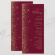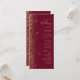 A borda esquerda deste elegante programa de casamento moderno apresenta um design de brilho dourado. O texto personalizável combina manuscrito pálido e dourado, fontes copperplate e itálico em um fundo vermelho burgundy.