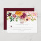 Flores russas, incluindo peônias e rosas em RSVPs de burgundy, amarelo-açafrão, mauve e rosa pálido. A parte de trás do cartão é burgundy.