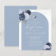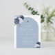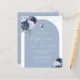 Este elegante convite para batismo apresenta uma forma empoeirada de arco azul sobre um fundo branco, flanqueado em dois cantos por um par de buquês florais azuis e azuis marinhos com folhagem prateada. Um terceiro buquê, menor, aparece numa cruz de folha de alumínio de prata, acima das palavras "por favor junte-se a nós para o batismo do nosso filho" em elegante caligrafia branca e itálico. Personalize-o com o nome no script branco e os detalhes na fonte sans serif. Uma aspersão de folha de papel fina prateada confunde o bordo superior da placa. O verso é azul sólido empoeirado.