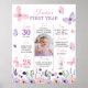 Celebre o primeiro ano da sua filha com a nossa Poster de Foto do Primeiro Ano da Floral de Borboleta! Adorados com borboletas delicadas, sotaques florais elegantes e tons pastéis macios de rosa e roxo, os marcos da sua menina, esta poster maravilhosamente projetada mostra as coisas favoritas da sua menina, e memórias especiais. Uma perfeita decoração de festas e manutenção, acrescenta um toque mágico a um aniversário com tema de jardim de borboletas enquanto capturava as memórias de precioso da sua pequena jornada através do seu primeiro ano!