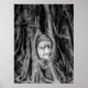 Poster preto e branco de uma cabeça de uma estátua Buda. A árvore cresceu ao redor da cabeça. De Wat Mahatha, Ayutthaya, Tailândia