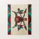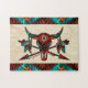 Aproveite este Quebra-cabeça de Caveira do Sudoeste de Buffalo! Ele apresenta um crânio de Búfalo do Sudoeste ou Bison e setas em um fundo de arenito... cercado pela Fronteira Sudoeste em Turquesa, Laranja e Negro! Este é um Design de Arte Gráfica Original criado pelo Artista Kerry Miller.
