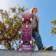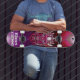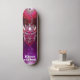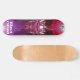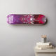 Skateboard da marca Dd, com obra de arte gráfica de uma cabeça de robô metálica vermelha e roxa com correntes elétricas subindo e descendo dela. O texto personalizado, na parte inferior da prancha, está pronto para ser personalizado para ler o que você quiser.