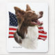 Border collie vermelho feliz headstudy na frente de uma bandeira americana de ondulação. Mostre seu orgulho em sua raça do cão e em seu país!