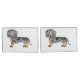 A ilustração original do desenho de Destei de um lindo cachorro preto de cabelo curto e casaco de cor de maçã bronzeada da raça Dachshund. O fundo tem um padrão de pegadas de cinza.