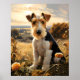 Um poster com uma cena de um Wire Hair Fox Terrier sentado em uma colina entre flores do campo no outono. Este poster certamente encantará qualquer um que ama Wire Hair Fox Terriers.