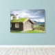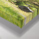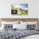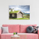 impressão de canvas de paisagem de uma cabine de madeira de telhado com relva em cima, com vista ao excelente sobre um vale verde e uma bandeira norueguesa no parque nacional de Jotunheimen, na Noruega.