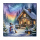 Uma imagem do estilo aquarela capturando uma tranquila noite de Natal com uma cabana de madeira e um boneco de neve feliz lá fora.