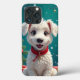 Cachorrinho branco de desenho animado com pelo fofinho e olhos grandes e expressivos. O cachorrinho está sentado entre caixas de presente coloridas, com uma coleira vermelha no pescoço que tem um pequeno sino preso. Ao fundo, há uma atmosfera festiva, completa com uma árvore de Natal decorada