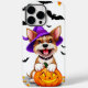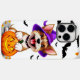 Cachorro alegre em estilo de desenho animado com uma expressão feliz, usando um chapéu de bruxa roxo. O cachorro está sentado em frente a uma abóbora esculpida que tem um rosto alegre e sorridente. Ao redor do cachorro estão pedaços coloridos de milho doce espalhados pelo chão, e vários morcegos voando ao fundo adicionam ao tema de Halloween