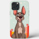 Cachorro alegre em estilo de desenho animado com orelhas grandes e expressivas e um grande sorriso. O cachorro tem uma pelagem principalmente cinza com uma mancha mais clara no peito. Ele senta-se felizmente na frente de caixas de presente coloridas, que são embrulhadas em papel brilhante e adornadas com fitas.
