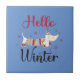 Uma bela ilustração de cão de patinação no gelo e as palavras: Olá inverno.