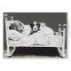 Uma carta bonita perfeita para amantes de cães. Um filhote preto e branco está bem acordado em seu berço enquanto sua mãe dorme. A fotografia é obra do fotógrafo americano Harry Whittier Frees (1879-1953), que publicou vários livros baseados em suas imagens engraçadas de cães e gatos antropomórficos. (Fundo modificado e cultura do trabalho original.)