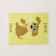 Um filhote reproduzindo com seu osso e nome personalizado de criança e quebra-cabeça de filhote.