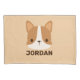 Uma design para animar o seu dia. Este design apresenta um cãozinho de córgi bonitinho com nome personalizado no estilo de fonte de sans serif moderna marrom em fundo castanho claro. Presentes personalizados perfeitos para crianças.