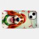Cachorro de desenho animado alegre, especificamente um beagle, usando um chapéu de Papai Noel vermelho e um cachecol verde. O cachorro tem uma expressão ampla e feliz, com a língua para fora e olhos brilhantes. Ao redor do cachorro estão presentes coloridos, alguns embrulhados em papel vermelho e verde brilhante com laços festivos. Há também elementos decorativos como guirlandas, flocos de neve e ornamentos de Natal