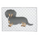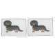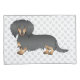A ilustração original do desenho de Destei de um lindo cão da raça Dachshund, preto e casaco bronzeado. O fundo tem um padrão de pegadas de cinza.