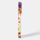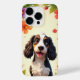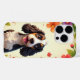 Cachorro encantador ao estilo cartoon com casaco preto e branco, sentado alegremente no meio de uma vibrante borda floral. Os olhos expressivos do cão e o sorriso largo transmitem uma sensação de alegria e brincadeira. À sua volta, flores coloridas em vários tons de rosa, laranja e roxo criam um pano de fundo animado e alegre, melhorando o sentimento alegre e caprichoso geral da imagem. O fundo é suave.