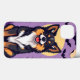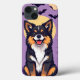 Ilustração em estilo de desenho animado de um cachorro, especificamente um Corgi, posicionado em frente a uma grande lua brilhante. O fundo é um céu roxo com vários morcegos voando e árvores nuas e assustadoras. O cachorro está sorrindo, mostrando sua personalidade brincalhona, com uma combinação de padrões de pelo preto, marrom e branco.
