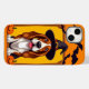 Ilustração em estilo de desenho animado de um cão beagle usando um chapéu de bruxa.