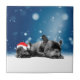 Filhotes de Bulldog Franceses bonitos dormindo em neve vestindo chapéu de Santa. Presente perfeito para o Natal!