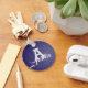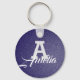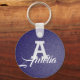 É uma cadeia de teclas azuis com um nome personalizado e um monograma em branco