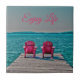 Algodão Adirondack preside azulejos decorativos cerâmicos. Trendy, chic, moderno, praia, rústico. Cores cor-de-rosa, lacrimejante e turquesa para o acampamento. Perfeito para aqueles que gostam de vida e relaxam na casa do lago na decoração da casa do verão. As citações e frases do Life são sempre uma conversa. Lago, doca de madeira com céu azul. Procure itens correspondentes na minha coleção de loja. Imagem copyright Marg Seregelyi Photography.
