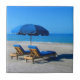 Cena da praia: Pares de cadeiras de sala de estar de madeira com um guarda-chuva de praia azul em um Sandy Beach.