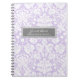 Caderno espiral do livro de hóspedes do casamento no teste padrão floral clássico pastel claro elegante do roxo da lavanda, o cinzento e o branco do damasco do vintage. Customizável com seus nomes e data do casamento.