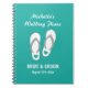 Encalhe o caderno do planejador do casamento do tema ou o jornal com chinelos do coração projeta. Organizador bonito para noivos contratados do casal/os futuros que planeiam seu partido do casamento. Tipografia elegante do roteiro com deslizadores da praia. O fundo bonito do azul do aqua/turquesa ou personaliza. Faça seu próprio livro pequeno acessível para para fazer a lista, o orçamento, os custos, as notas e os planos. Tipografia escrita à mão do estilo com sandálias do verão. Verão que wedding em junho, julho, august.