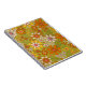 Este notebook apresenta um padrão floral retrô, inspirado por designs dos anos 60 e 70, com flores em tons de laranja, amarelo, rosa e verde-oliva em fundo verde