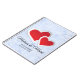 Um caderno do planejador de casamento com uma ilustração de dois corações de papel unidos - vermelho com uma borda branca. Colocado sobre um fundo de mármore azul elegante.