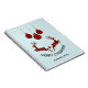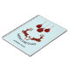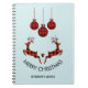 Um notebook personalizado que diz "Feliz Natal" em texto curvo. Projetado com uma ilustração de 2 cervos de Natal saltando. Os cervejeiros são feitos de xadrez vermelha e preta, com um pouco de coração entre eles. As decorações de natal de xadrez vermelha e preta penduram no topo. Fundo azul claro.