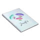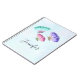 Um notebook personalizado com um design bonito. 3 borboletas de aquarela, pintadas de rosa, roxo e verde. Um fundo de aquarela azul claro com pistas de rosa claro.