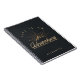 caderno espiral personalizado com uma ilustração dourada sobre fundo de cinza preta. Projetado com uma ilustração de uma montanha com raios solares brilhando por trás. A tipografia diz: "A vida é uma descoberta de sonho de uma Aventura".