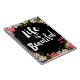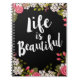 Lindos florescimentos de flores e botões ranóculos cor-de-rosa circulam as bordas deste lindo notebook de tamanho diário que lê "A vida é bela" em textos tendenciosos, escritos à mão na frente.