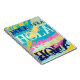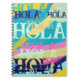 Texto Hola repetido numa paleta colorida de azul, amarelo, rosa, turquesa e verde.