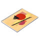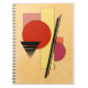 Um triângulo preto dividido em segmentos, uma banda trapezoidal preta dividida em duas, um círculo vermelho, um retângulo amarelo, um quadrado vermelho pálido, um círculo roxo, e uma característica quadrada laranja nesta arte abstrato de sobreposição de formas por Richard H. Fay.