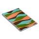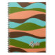 Este notebook tem um design de estilo 1970 que possui uma paleta de cores impressionante. As cores dominantes apresentadas são o pêssego, o verde-oliva, o lacre e o castanho-escuro. A design apresenta faixas de onda abstrato que acrescentam um movimento táctil à estética geral. Essas listras são um acento às tendências artísticas dos anos 1970. Para tornar este notebook verdadeiramente exclusivo, há também a opção de incluir texto personalizado para seu nome.