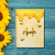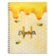Amarelo, fundo branco com um padrão de favo de mel. Decorado com mel dourado doce pingando e alegres abelhões. Modelos para o seu nome e letra de monograma. Perfeito para manter suas notas trabalhando de casa, suas receitas de verão ou notas do jardim e quintal.
