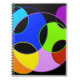 Design colorida e geométrica, intersetando círculos com cores arco-íris sobre fundo preto