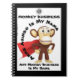 Notebook espiral preto e branco com "MONKEY BUSINESS ARMS AKIMBO É O MEU NOME E O MACACACO É O MEU JOGO" e com uma fotografia do Arms Akimbo. Além disso, com o logotipo Y-NOT-ME e Y-NOT-ME. Braços Akimbo é um super-herói da floresta tropical. Ele tem uma história de fundo muito interessante. Talvez eu te conte às vezes.